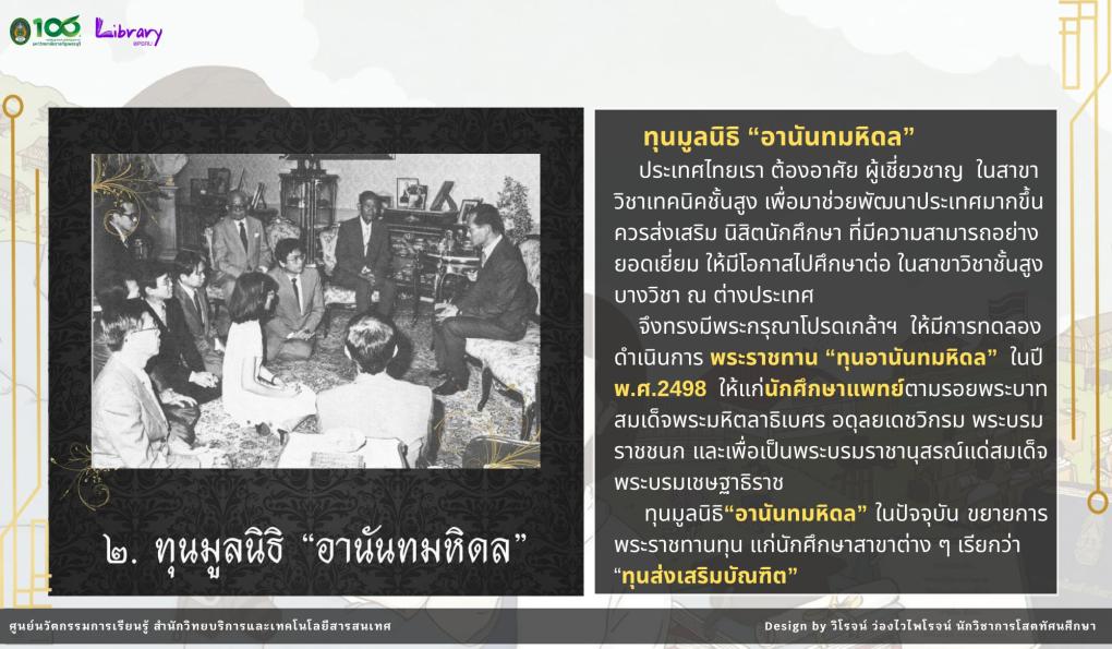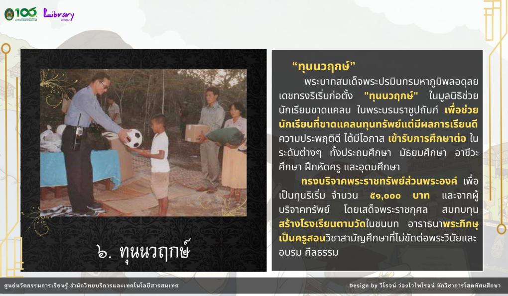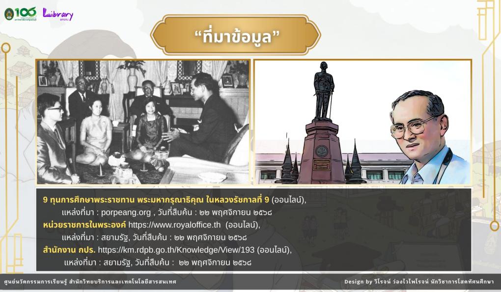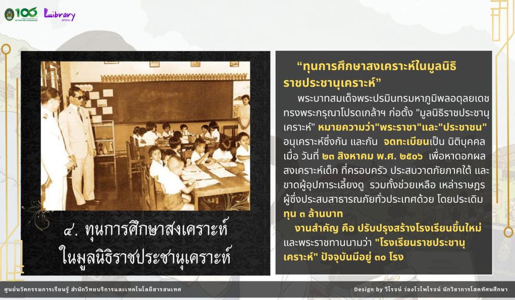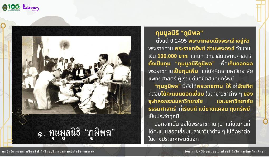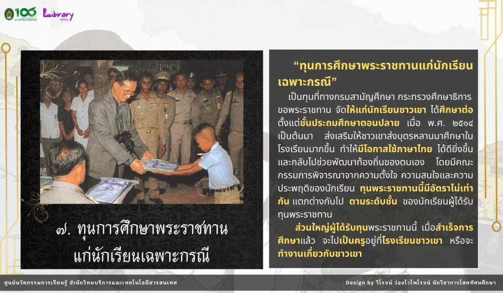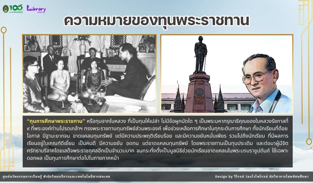 นิทรรศการนี้จัดทำขึ้นเพื่อเผยแพร่พระมหากรุณาธิคุณ ของพระบาทสมเด็จพระมหาภูมิพลอดุลยเดชมหาราช บรมนาถบพิตร ที่ทรงให้ความสำคัญต่อการศึกษาของเยาวชนไทย ผ่าน “ทุนพระราชทาน” ซึ่งเปรียบเสมือนเมล็ดพันธุ์แห่งความดีงาม ที่ช่วยสร้างโอกาสทางการศึกษา พัฒนาศักยภาพของเยาวชน ให้เติบโตเป็นกำลังสำคัญในการพัฒนาประเทศชาติให้มั่นคงและยั่งยืน