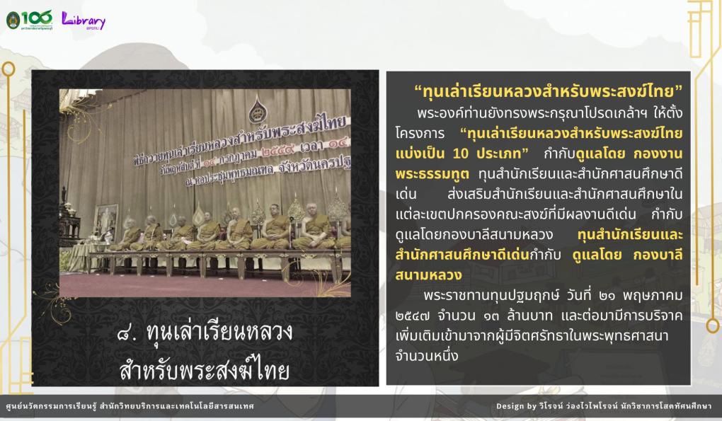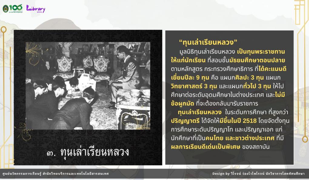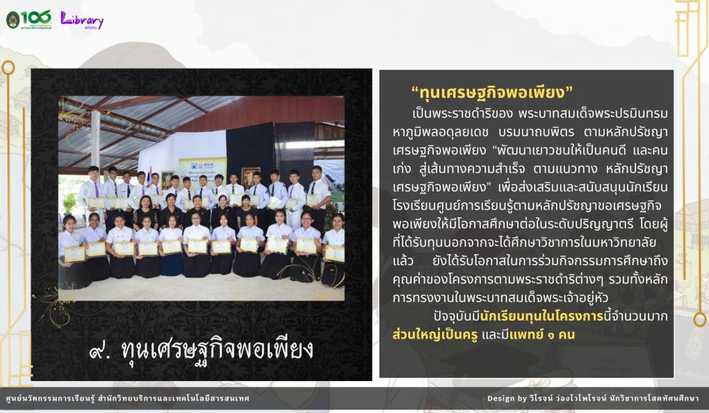 ภายในนิทรรศการ นำเสนอเรื่องราวของ ๙ ทุนพระราชทาน ตั้งแต่แนวพระราชดำริ วัตถุประสงค์ ไปจนถึงผลลัพธ์ที่เกิดขึ้นกับผู้ได้รับทุน ซึ่งสะท้อนถึงพระวิสัยทัศน์อันยิ่งใหญ่ในการ “สร้างคน เพื่อสร้างชาติ”