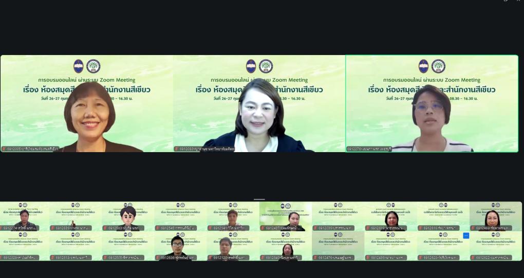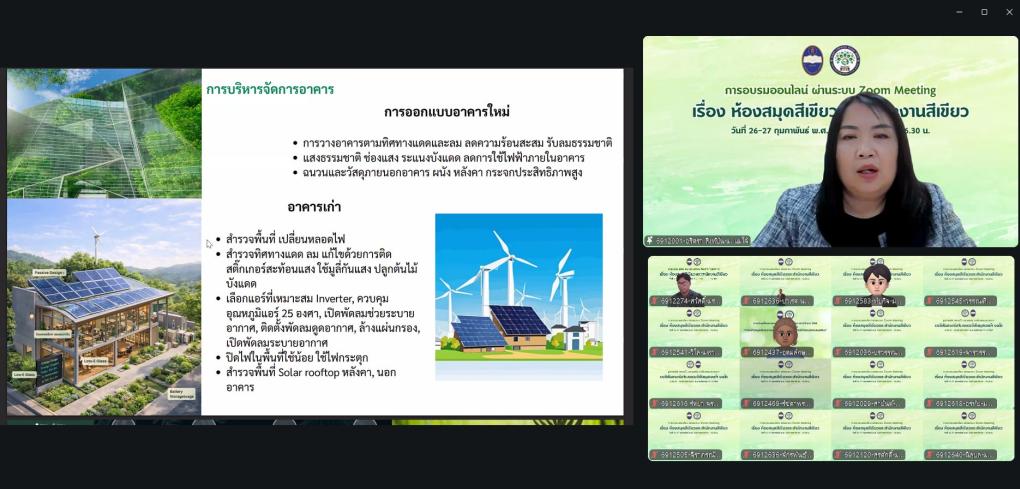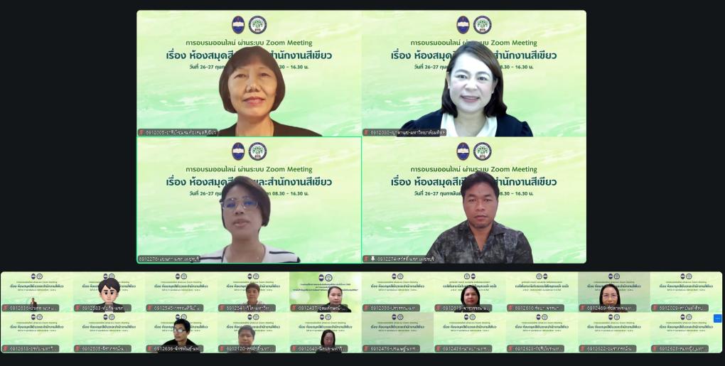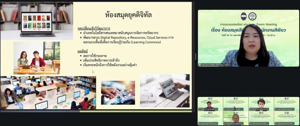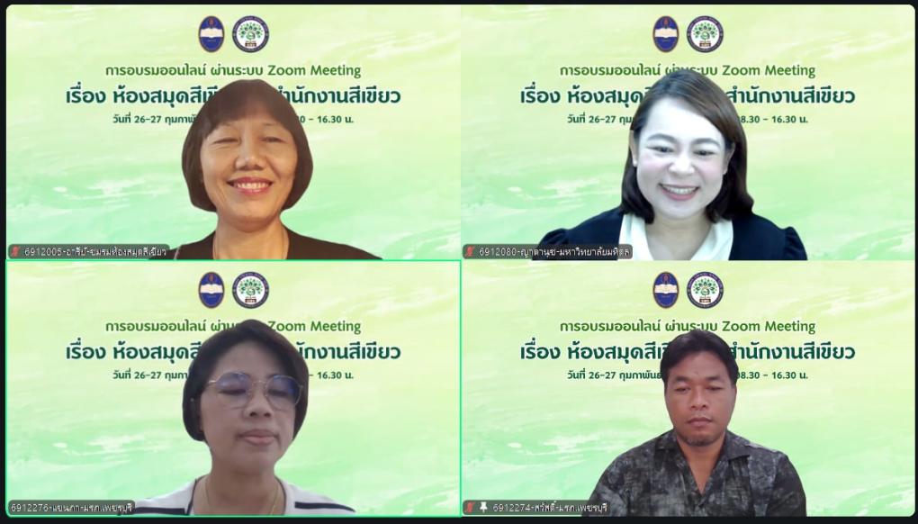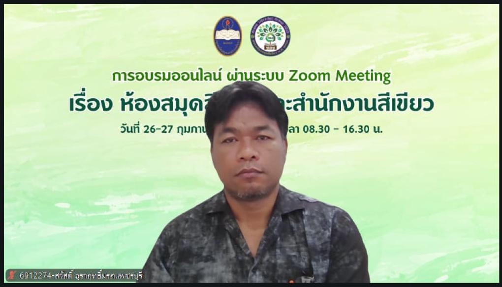 คณะผู้บริหารและบุคลากรสำนักวิทยบริการฯ มหาวิทยาลัยราชภัฏเพชรบุรี เข้าร่วมการอบรมออนไลน์ ผ่านระบบ Zoom Meeting เรื่องห้องสมุดสีเขียวและสำนักงานสีเขียว เกี่ยวกับความสำคัญของสำนักงานสีเขียว การใชัพลังงานและทรัพยากรอย่างมีประสิทธิภาพ การจัดการมลพิษและของเสีย การจัดซื้อจัดจ้างที่เป็นมิตรกับสิ่งแวดล้อม และก๊าซเรือนกระจก