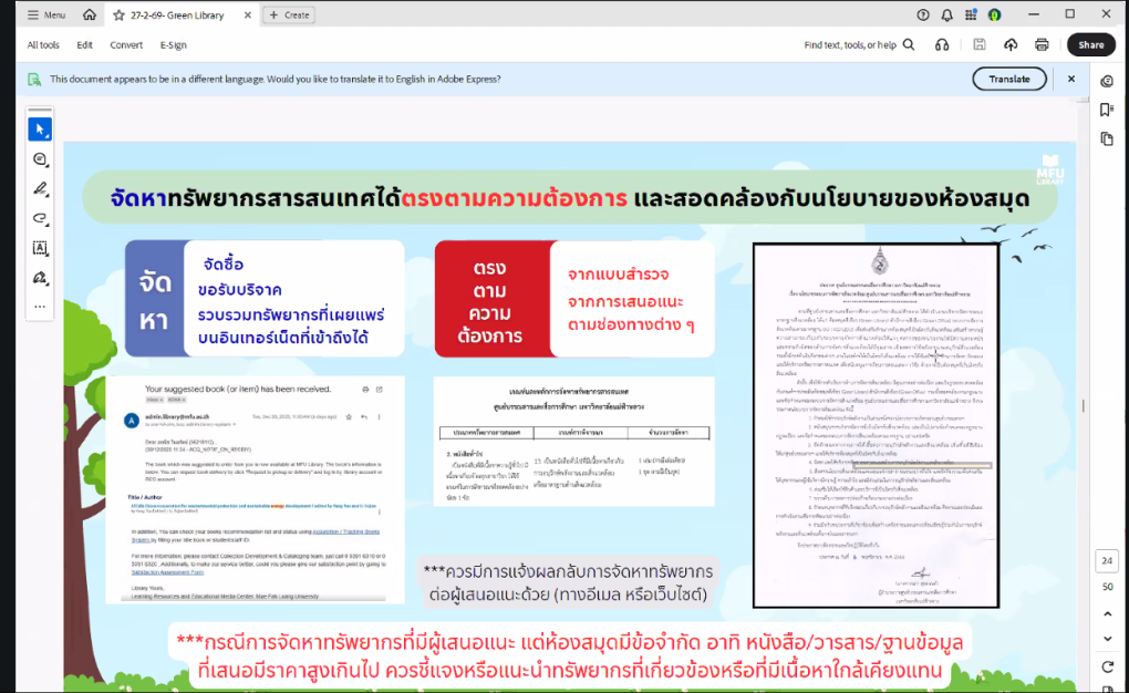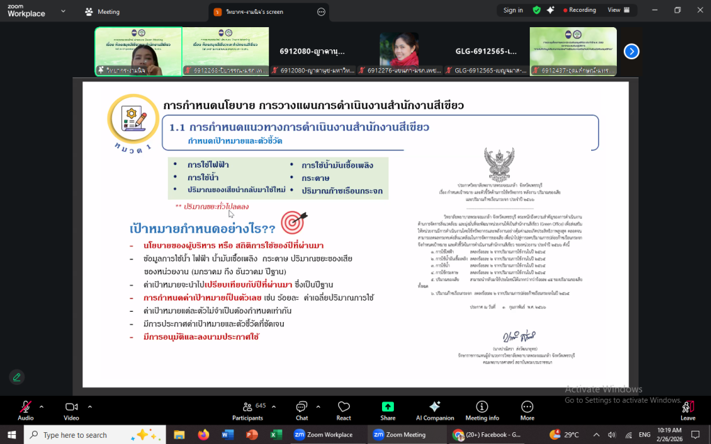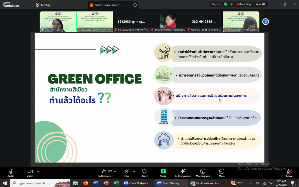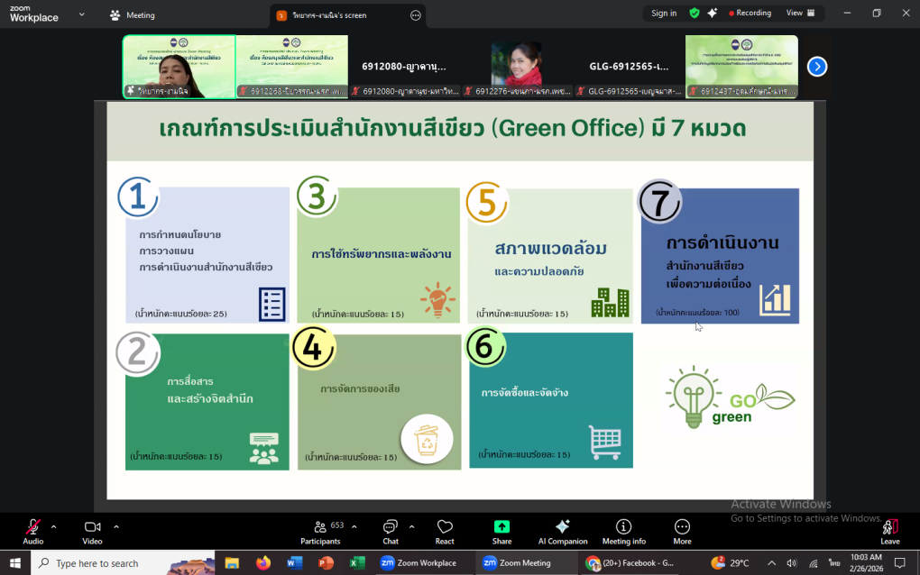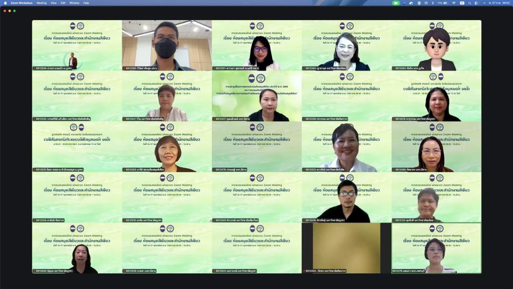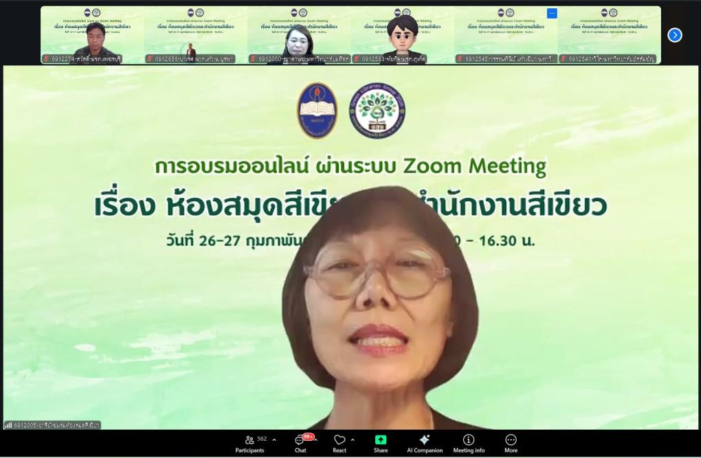 คณะผู้บริหารและบุคลากรสำนักวิทยบริการฯ มหาวิทยาลัยราชภัฏเพชรบุรี เข้าร่วมการอบรมออนไลน์ ผ่านระบบ Zoom Meeting เรื่องห้องสมุดสีเขียวและสำนักงานสีเขียว เกี่ยวกับความสำคัญของสำนักงานสีเขียว การใชัพลังงานและทรัพยากรอย่างมีประสิทธิภาพ การจัดการมลพิษและของเสีย การจัดซื้อจัดจ้างที่เป็นมิตรกับสิ่งแวดล้อม และก๊าซเรือนกระจก