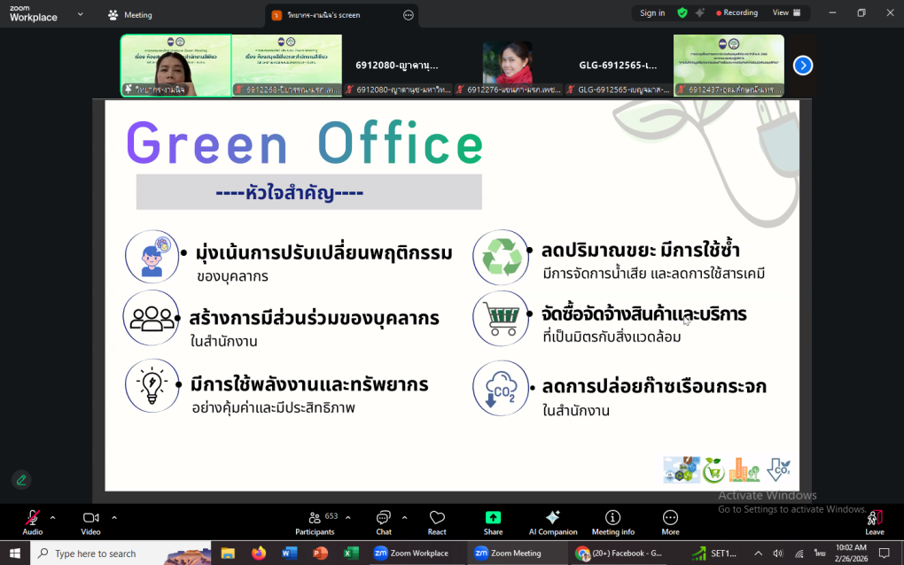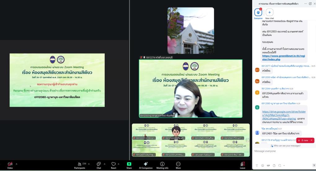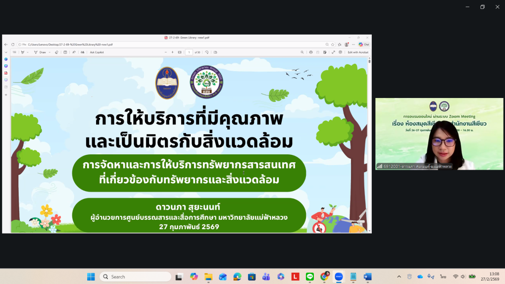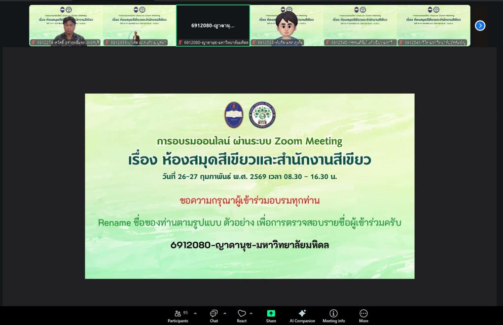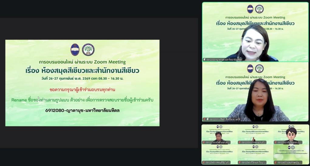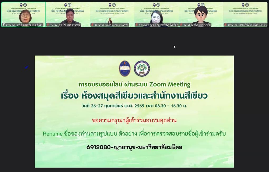 วันที่ 26–27 กุมภาพันธ์ 2569 เวลา 08.30 – 16.30 น. คณะผู้บริหารและบุคลากรสำนักวิทยบริการฯ มหาวิทยาลัยราชภัฏเพชรบุรี นำโดยอาจารย์ปิยวรรณ คุสินธุ์ ผู้อำนวยการสำนักวิทยบริการฯ เข้าร่วมการอบรมออนไลน์ ผ่านระบบ Zoom Meeting เรื่องห้องสมุดสีเขียวและสำนักงานสีเขียว มี ดร.อารีย์ ธัญกิจจานุกิจ ประธานชมรมห้องสมุดสีเขียว เป็นประธานเปิดการอบรม จากนั้นเป็นการอบรม เรื่อง การจัดการททรัพยากรและสิ่งแวดล้อม โดย นางสาวงามนิจ อนุศาสนี นักวิชาการสิ่งแวดล้อมชำนาญการ กรมการเปลี่ยนแปลงภูมิอากาศและสิ่งแวดล้อม เป็นวิทยากรถ่ายทอดความรู้ เกี่ยวกับความสำคัญของสำนักงานสีเขียว การใชัพลังงานและทรัพยากรอย่างมีประสิทธิภาพ การจัดการมลพิษและของเสีย การจัดซื้อจัดจ้างที่เป็นมิตรกับสิ่งแวดล้อม และก๊าซเรือนกระจก