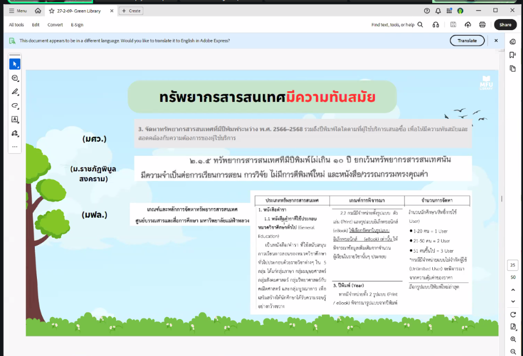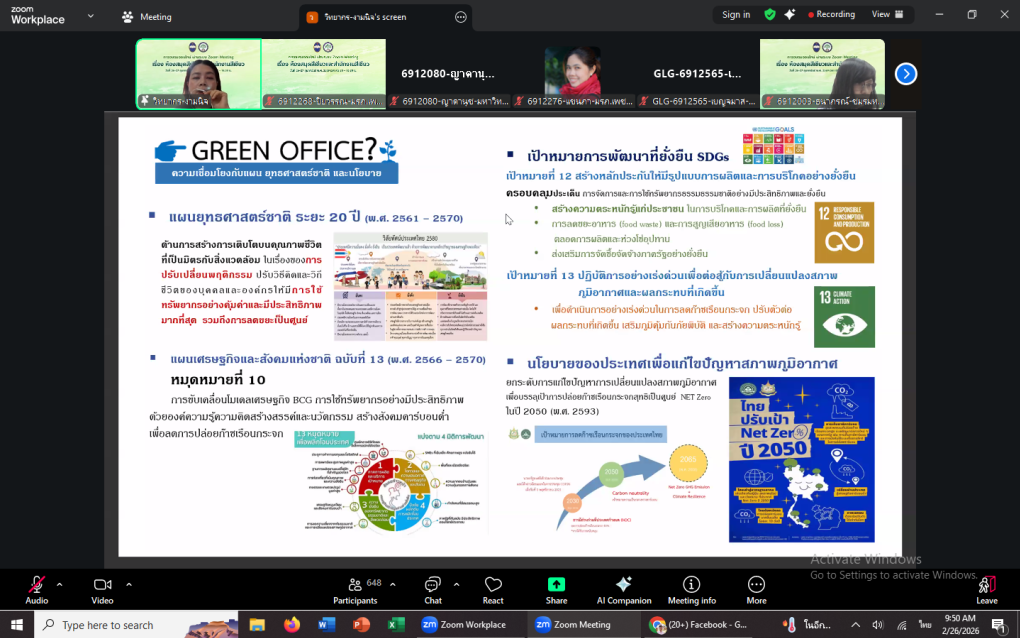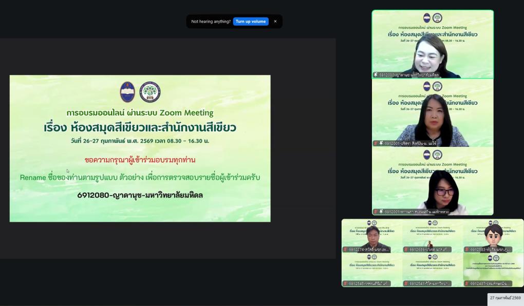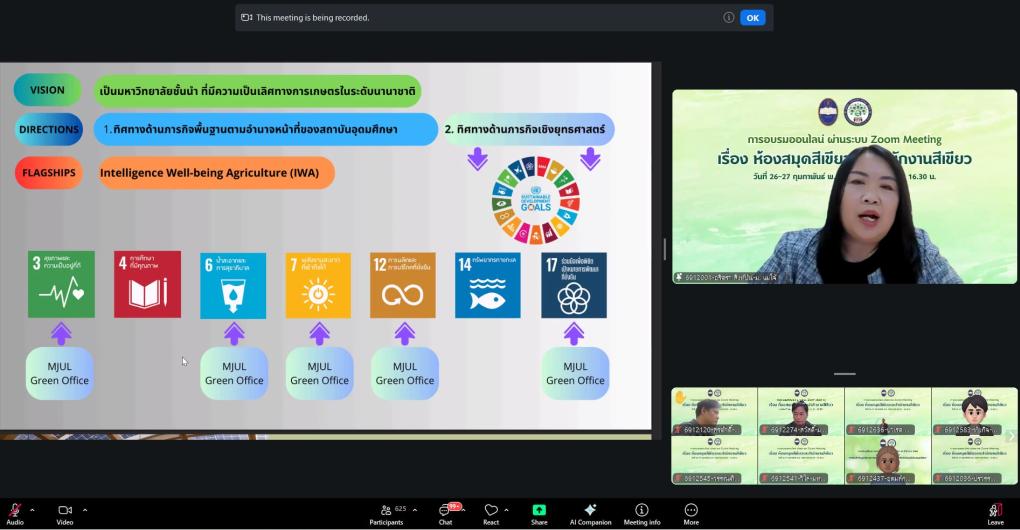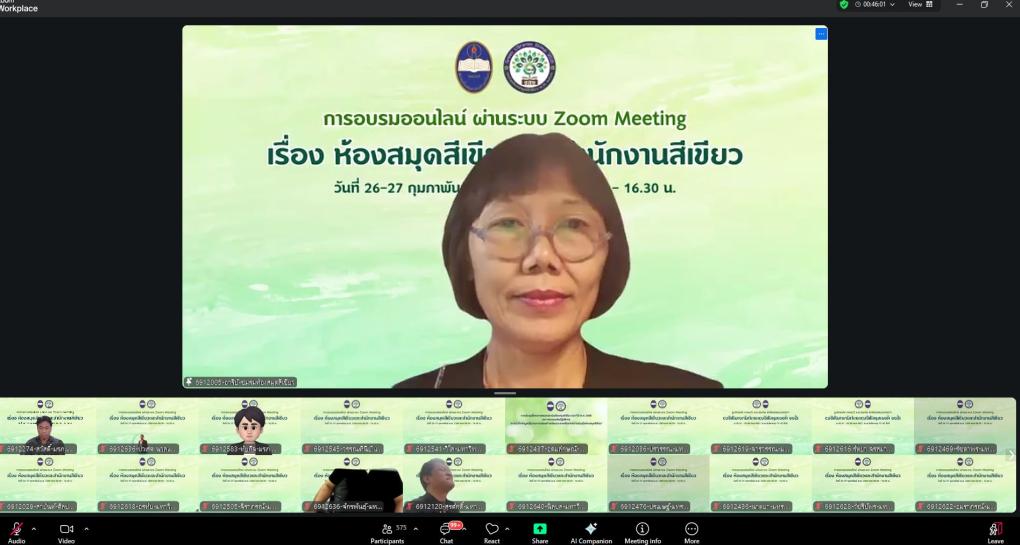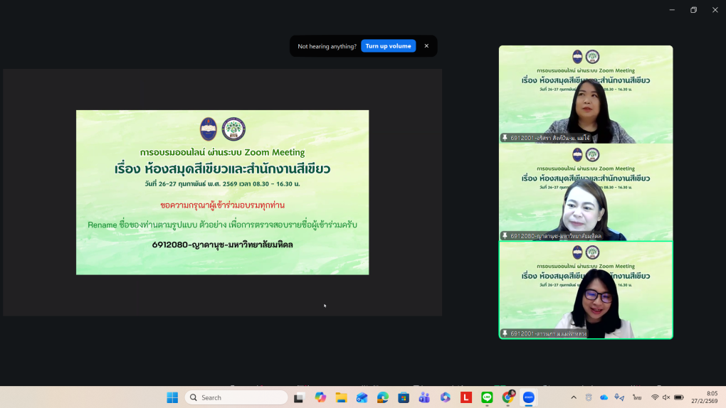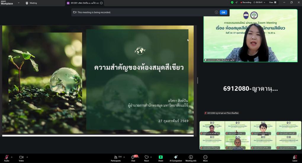 วันที่ 26–27 กุมภาพันธ์ 2569 เวลา 08.30 – 16.30 น. คณะผู้บริหารและบุคลากรสำนักวิทยบริการฯ มหาวิทยาลัยราชภัฏเพชรบุรี นำโดยอาจารย์ปิยวรรณ คุสินธุ์ ผู้อำนวยการสำนักวิทยบริการฯ เข้าร่วมการอบรมออนไลน์ ผ่านระบบ Zoom Meeting เรื่องห้องสมุดสีเขียวและสำนักงานสีเขียว มี ดร.อารีย์ ธัญกิจจานุกิจ ประธานชมรมห้องสมุดสีเขียว เป็นประธานเปิดการอบรม จากนั้นเป็นการอบรม เรื่อง การจัดการททรัพยากรและสิ่งแวดล้อม โดย นางสาวงามนิจ อนุศาสนี นักวิชาการสิ่งแวดล้อมชำนาญการ กรมการเปลี่ยนแปลงภูมิอากาศและสิ่งแวดล้อม เป็นวิทยากรถ่ายทอดความรู้ เกี่ยวกับความสำคัญของสำนักงานสีเขียว การใชัพลังงานและทรัพยากรอย่างมีประสิทธิภาพ การจัดการมลพิษและของเสีย การจัดซื้อจัดจ้างที่เป็นมิตรกับสิ่งแวดล้อม และก๊าซเรือนกระจก