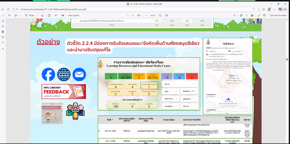 ในวันศุกร์ที่ 27 กุมภาพันธ์ 2569 เป็นการอบรมเรื่อง การจัดการห้องสมุดสีเขียว โดยนางอริศรา สิงห์ปัน ผู้อำนวยการสำนักหอสมุด มหาวิทยาลัยแม่โจ้ และนางดาวนภา สุยะนนท์ ผู้อำนวยการศูนย์บรรณสารและสื่อการศึกษา มหาวิทยาลัยแม่ฟ้าหลวง ให้ความรู้และแบ่งปันประสบการณ์ เรื่องความสำคัญของห้องสมุดสีเขียว การบริหารจัดการห้องสมุดสีเขียวและการลดปริมาณการปล่อยก๊ษซเรือนกระจก การให้บริการที่มีคุณภาพและเป็นมิตรกับสิ่งแวดล้อม และการจัดหาและการให้บริการทรัพยากรสารสนเทศที่เกี่ยวข้องกับทรัพยากรและสิ่งแวดล้อม โดยมีบุคลากรสำนักวิทยบริการฯ เข้าร่วมอบรมทั้งหมด 21 คน